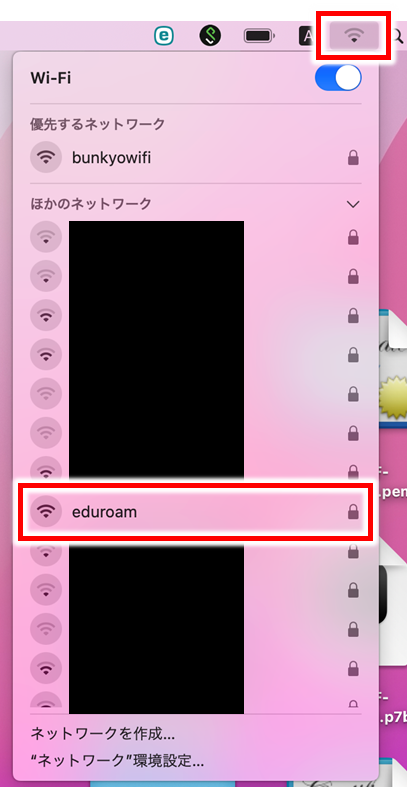 - デスクトップ上部のWi-Fi設定から、【Bunkyo-WiFi】を選択