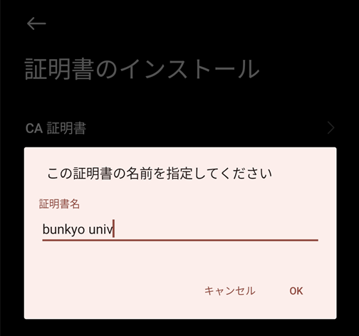 - 証明書に自身が分かりやすい名前を付け、OKをタップする。(例:bunkyo univ)