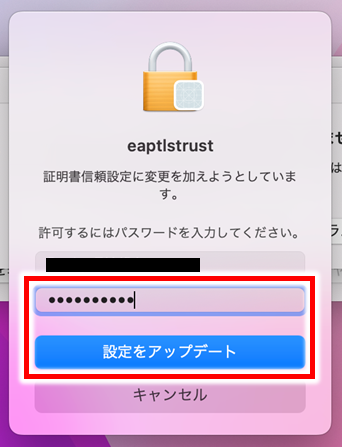 「eaptstrust」のウインドウで、自分のMacのログインID/パスワード入力をし【設定をアップデート】をクリック