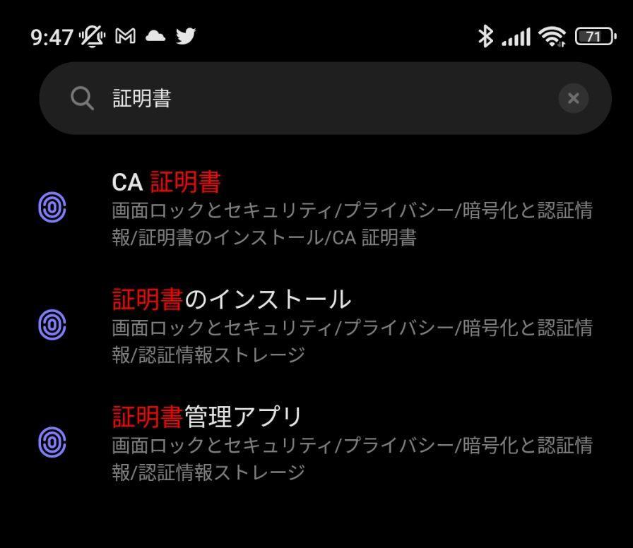 【証明書のインストール】画面を出すには、設定画面の検索窓から「証明書」と検索してください。![]()